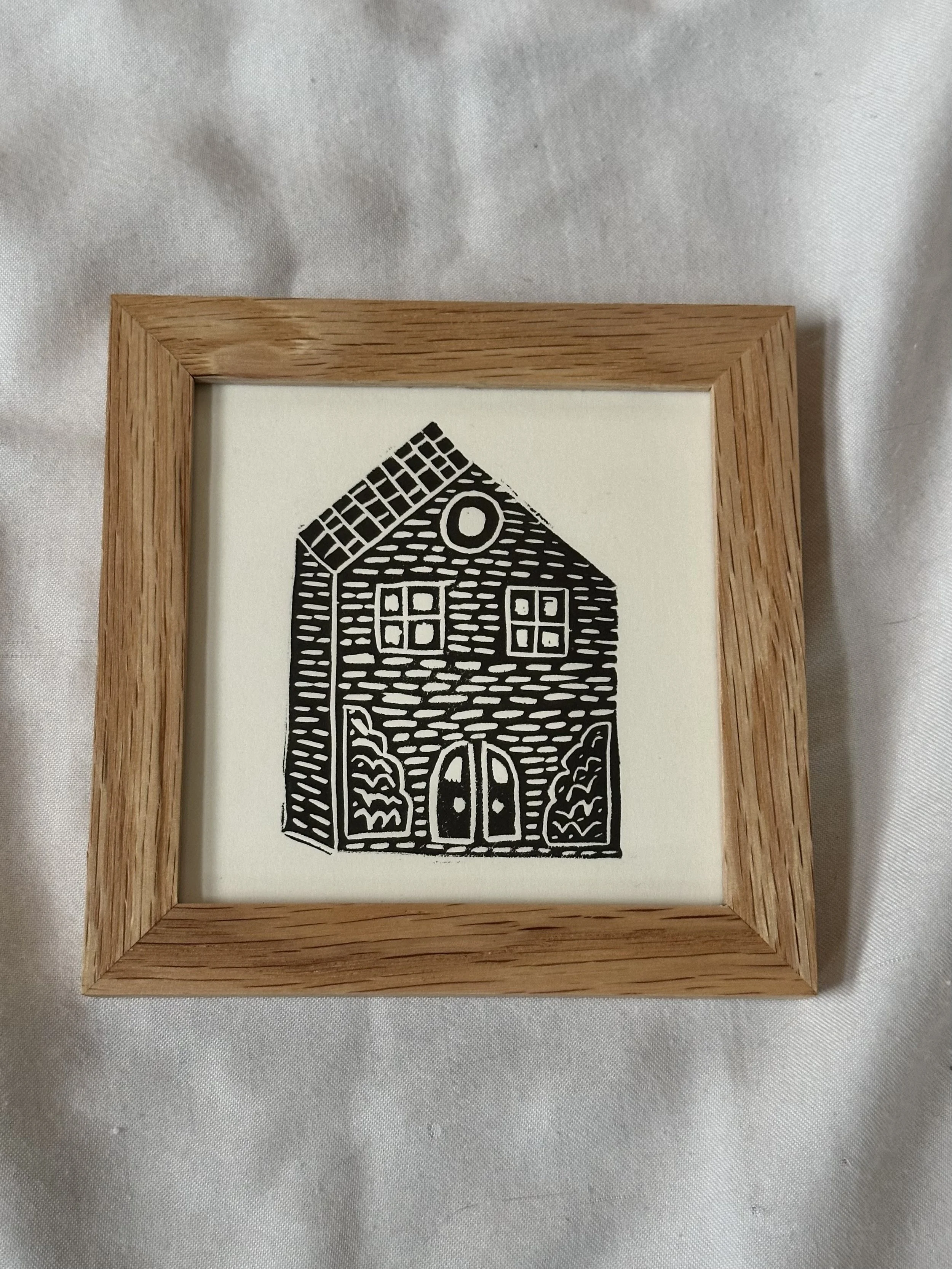This hand-carved and hand-printed mini print is a perfect addition to warm up a nook or corner of your home. The intricate details of the bricks and roof, paired with rustic windows and bushes by the front porch come together to form a whimsical abode.